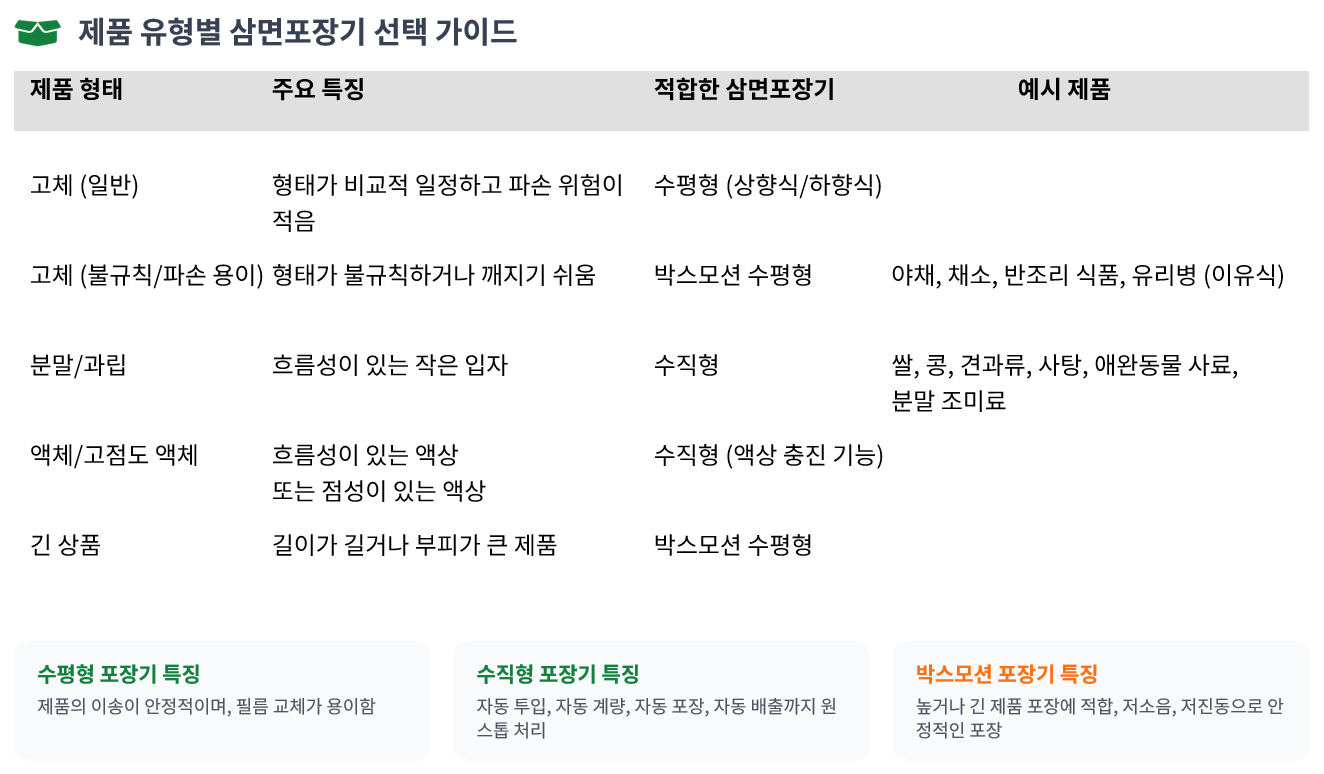 포장하려는 제품의 크기, 형태, 특성에 따라 하단식, 상단식, 박스모션, 로터리 방식 등 다양한 삼면포장기 모델 중 적합한 타입을 골라야 합니다.