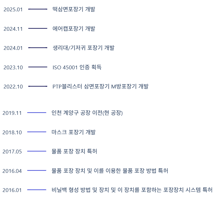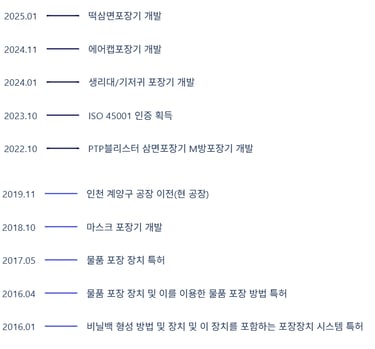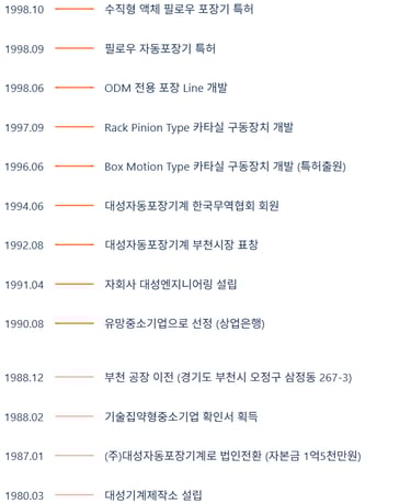 1980년 창업이래, 개별(낱개)제품 포장 자동화 분야에서 시작하여 Multi제품, Bundle제품 포장 공정까지 시장의 Trend와 고객사의 Needs에